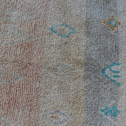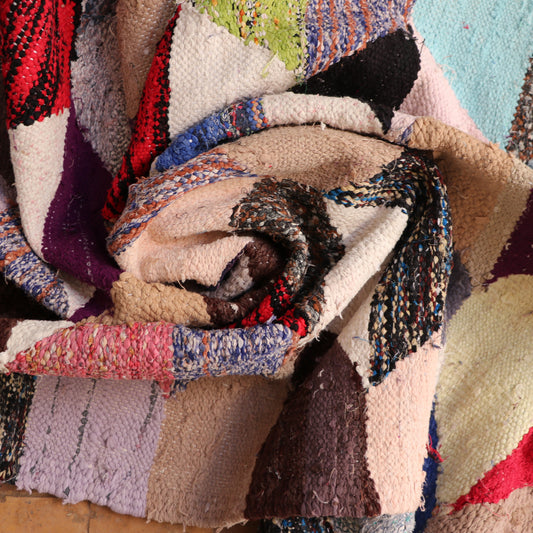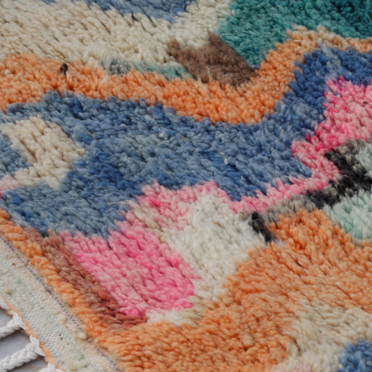 Boujaad Teppiche stammen aus der Region vor dem Hohen Atlas in Marokko und sind bekannt für ihre Vielfalt, lebhaften Farben und einzigartigen Muster. Die speziell kurzflorigen Teppiche werden aus robuster Schafwolle gefertigt und zeichnen sich durch eine faszinierende Vielfalt an Designs aus, die nicht selten von traditionellen Motiven inspiriert sind. Jeder Teppich ist ein handgefertigtes Unikat, das die Kreativität und das kulturelle Erbe der Berberfrauen widerspiegelt.