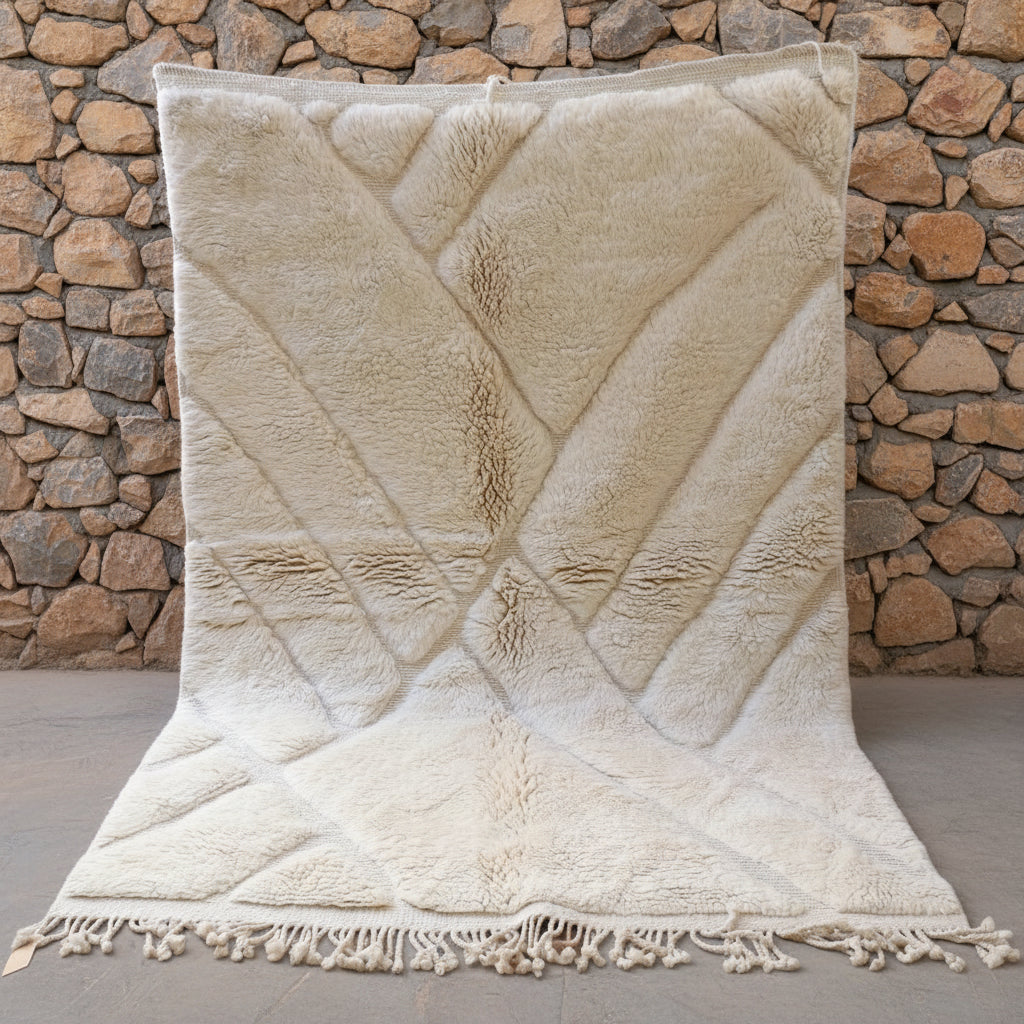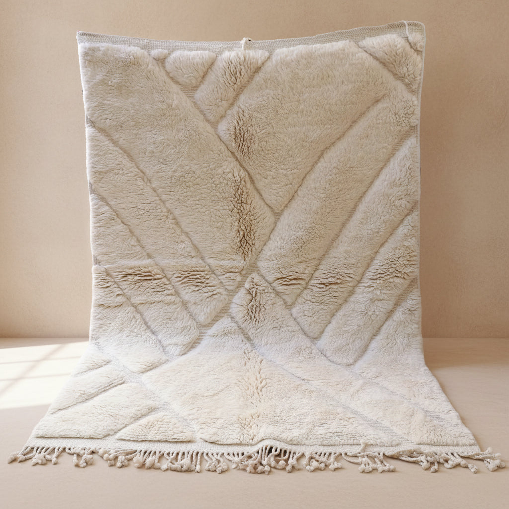 Pflege Wollteppiche (Beni Ourain, Beni Mrirt, Azial): Die Teppiche können ohne rotierende oder klopfende Bürsten abgesaugt werden. Wir empfehlen den Teppich gelegentlich auszuklopfen oder auszuschlagen, das entfernt effektiv Staub und Schmutz und der Teppich sieht wieder wunderbar frisch aus.