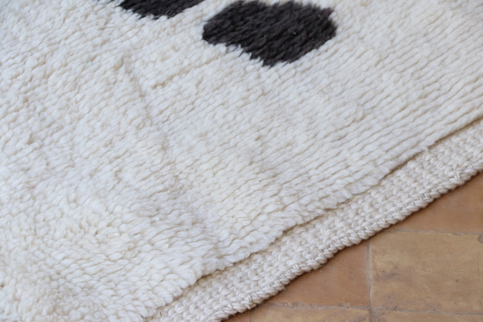 Pflege Wollteppiche (Beni Ourain, Beni Mrirt, Azial): Die Teppiche können ohne rotierende oder klopfende Bürsten abgesaugt werden. Wir empfehlen den Teppich gelegentlich auszuklopfen oder auszuschlagen, das entfernt effektiv Staub und Schmutz und der Teppich sieht wieder wunderbar frisch aus.