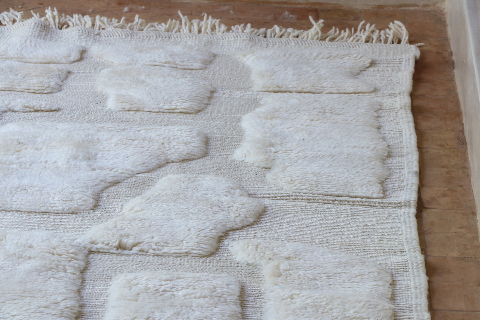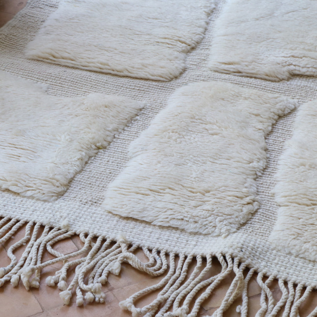Pflege Wollteppiche (Beni Ourain, Beni Mrirt, Azial): Die Teppiche können ohne rotierende oder klopfende Bürsten abgesaugt werden. Wir empfehlen den Teppich gelegentlich auszuklopfen oder auszuschlagen, das entfernt effektiv Staub und Schmutz und der Teppich sieht wieder wunderbar frisch aus.