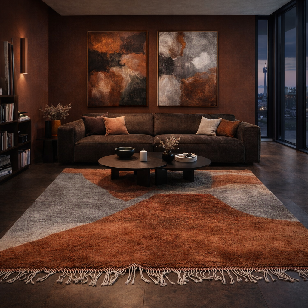 Tazribt (bedeutet „Weg“ oder „Pfad“ auf Tamazight) ist ein handgeknüpfter Beni Mrirt, dessen Grau/Nude- und Kupfertöne wie ein stiller Pfad durch sanfte Landschaften führen. Die abstrakte Formensprache verleiht ihm Ruhe und Tiefe, ein Teppich mit Charakter, der bleibt.