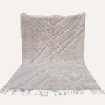 Tifawin ist ein naturfarbener Beni Mrirt mit sanft verlaufenden Linien, die wie Lichtstrahlen über die Oberfläche ziehen. Sein Design wirkt ruhig und weit, als würde er Räume öffnen statt sie zu füllen.