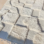 Berberteppich Beni Mrirt Design Tales ist ein moderner Berberteppich, der zeitlose Eleganz mit innovativem Design vereint. Sein heller Farbton verleiht jedem Raum eine luftige Leichtigkeit und Größe, während die unterschiedliche Struktur des Teppichs (geknüpfte und gewebte Bereiche) ihm eine facettenreiche, lebendige Struktur verleiht.