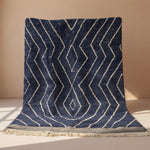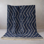 Beni Mrirt Teppich Azraq ist ein Beni Mrirt von stiller Kraft: tiefes Blau, durchzogen von klaren, kraftvollen Linien, die wie Spuren von Bewegung im Raum liegen.