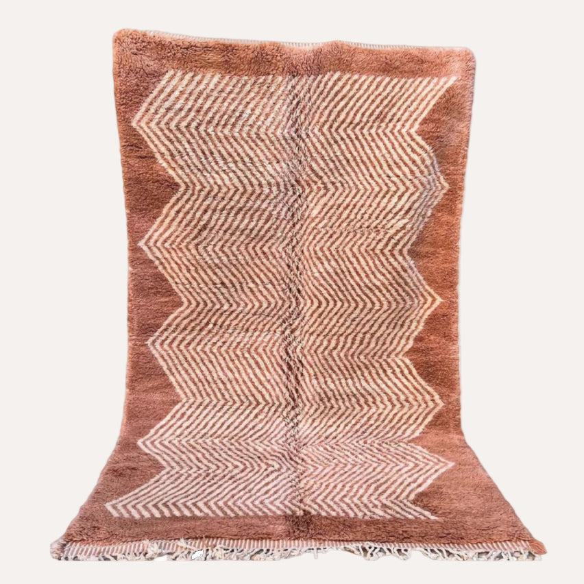 Berberteppich Beni Mrirt Terra ist ein eindrucksvoller, farbstarker Berberteppich, der an die rote Erde Marokkos erinnert und dennoch den Sprung in zeitgenössisches Design schafft. Er bringt ein warmes Leuchten und viel Lebendigkeit mit in euer Zuhause.