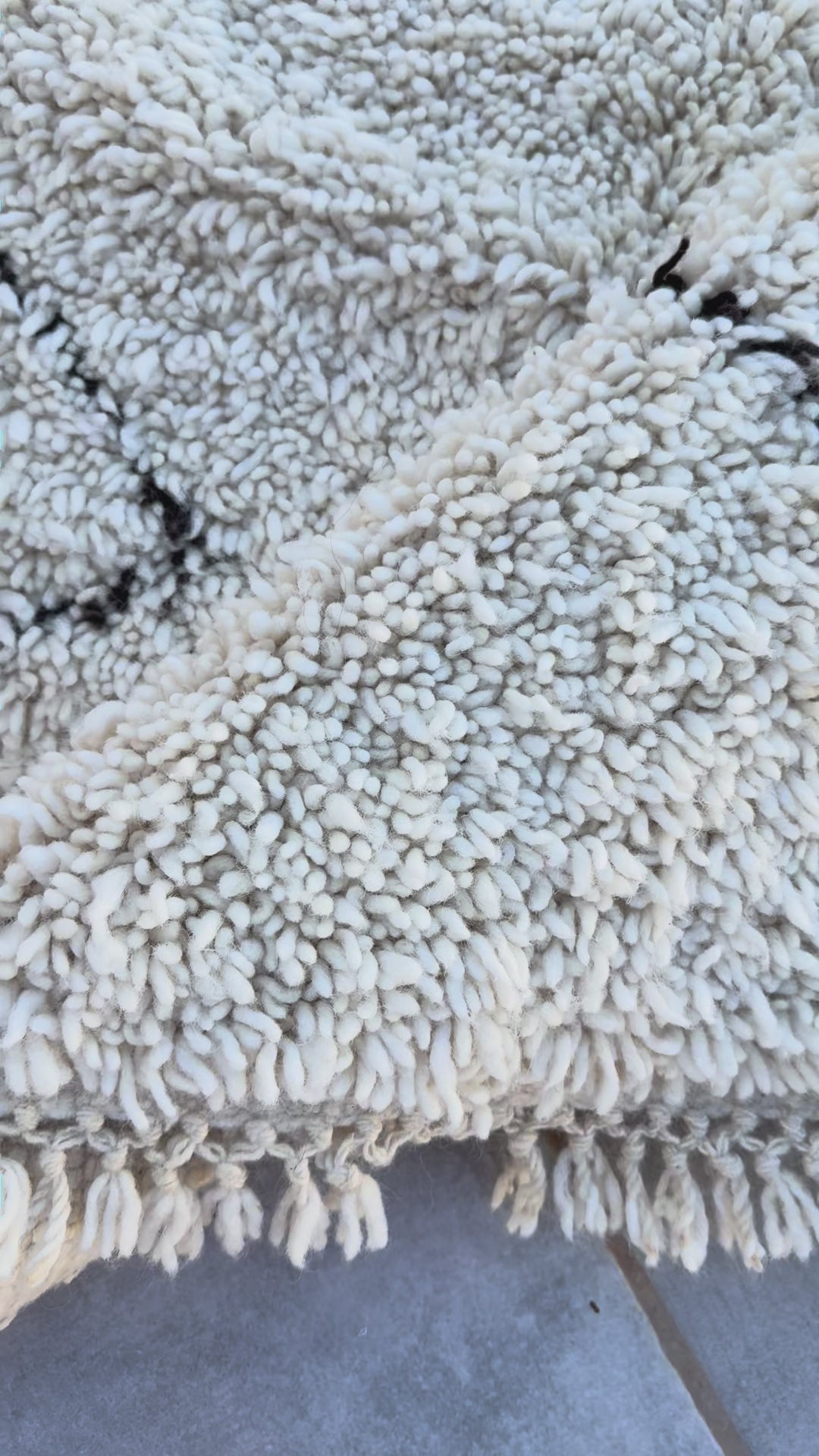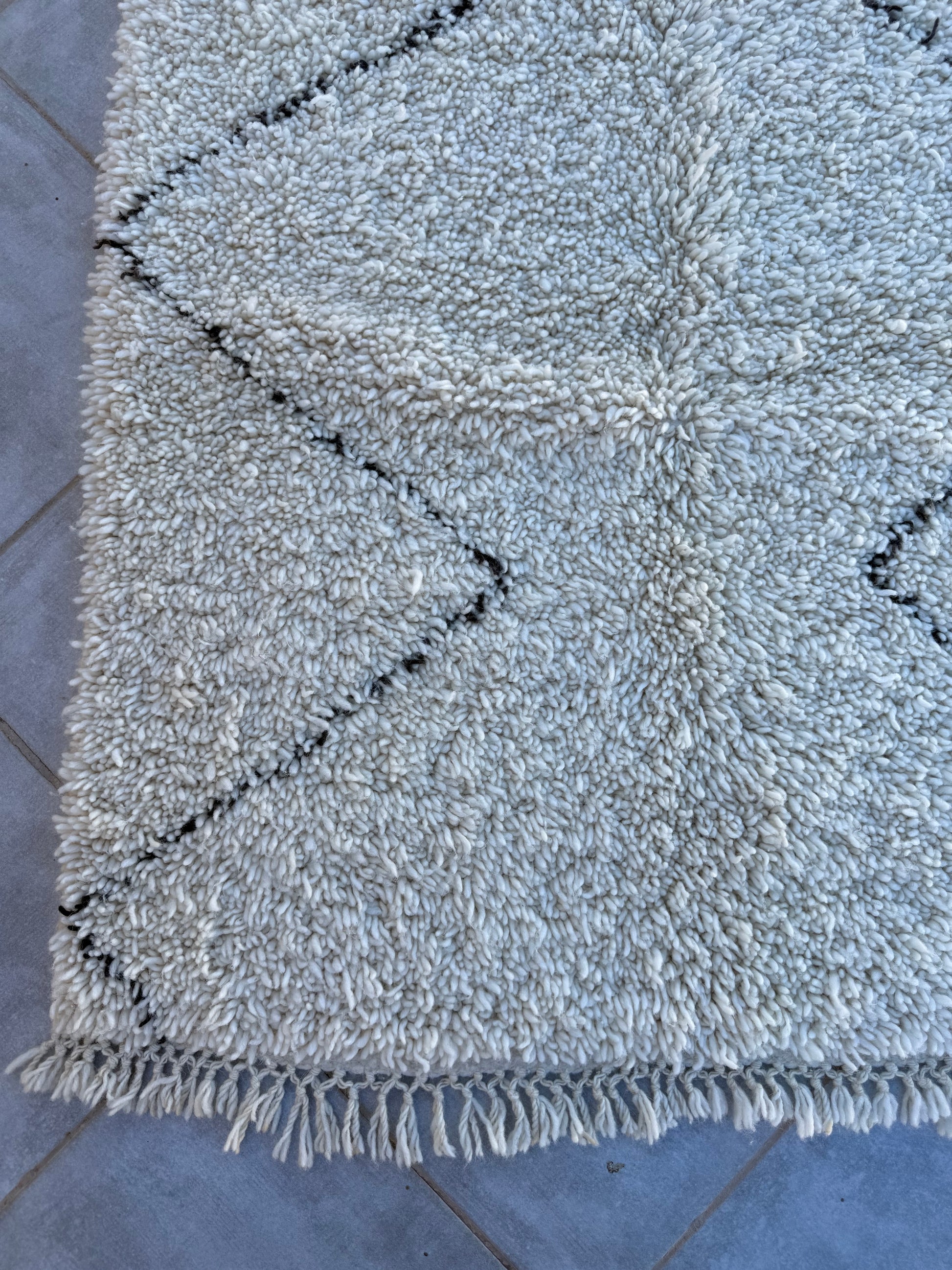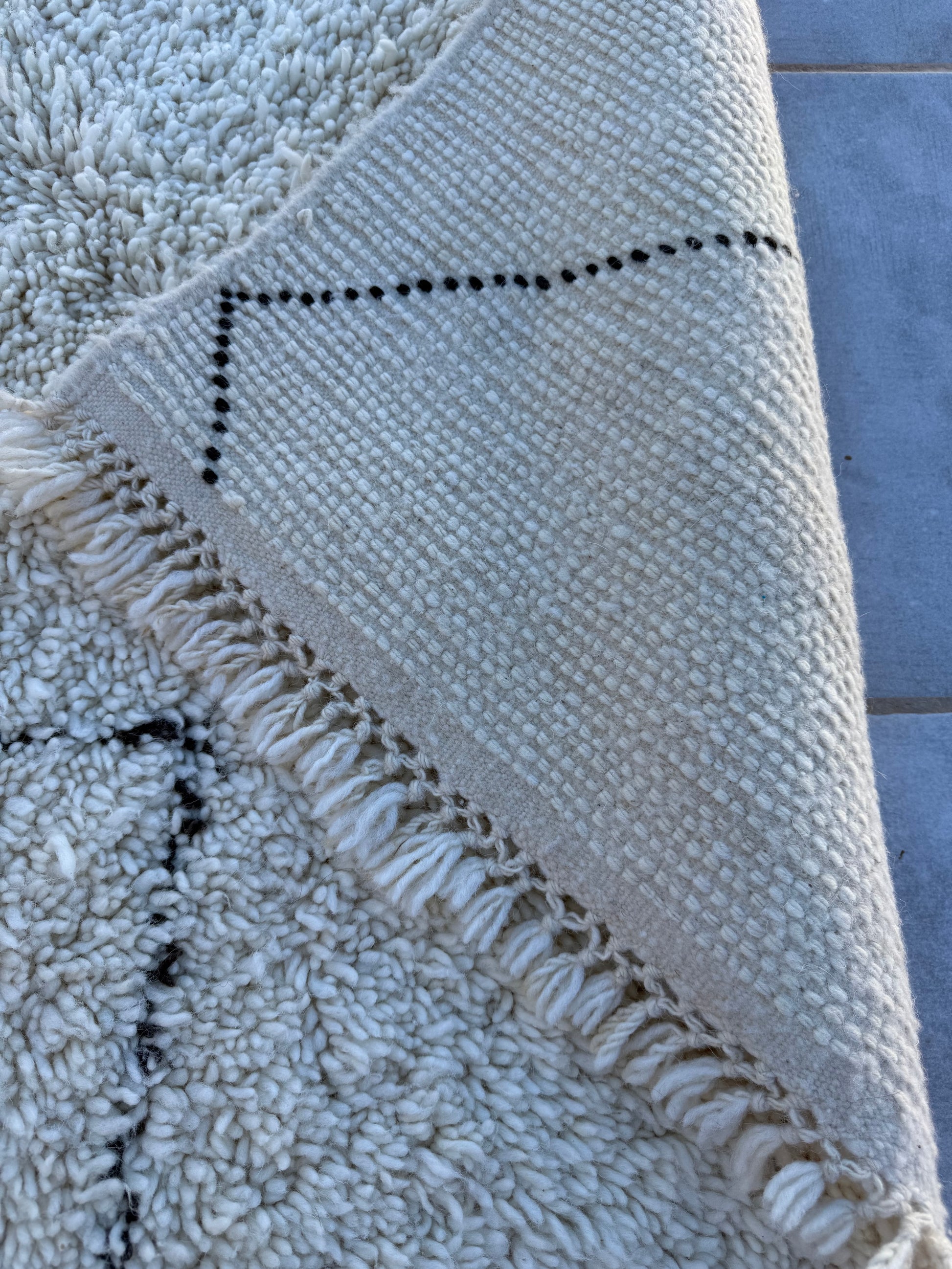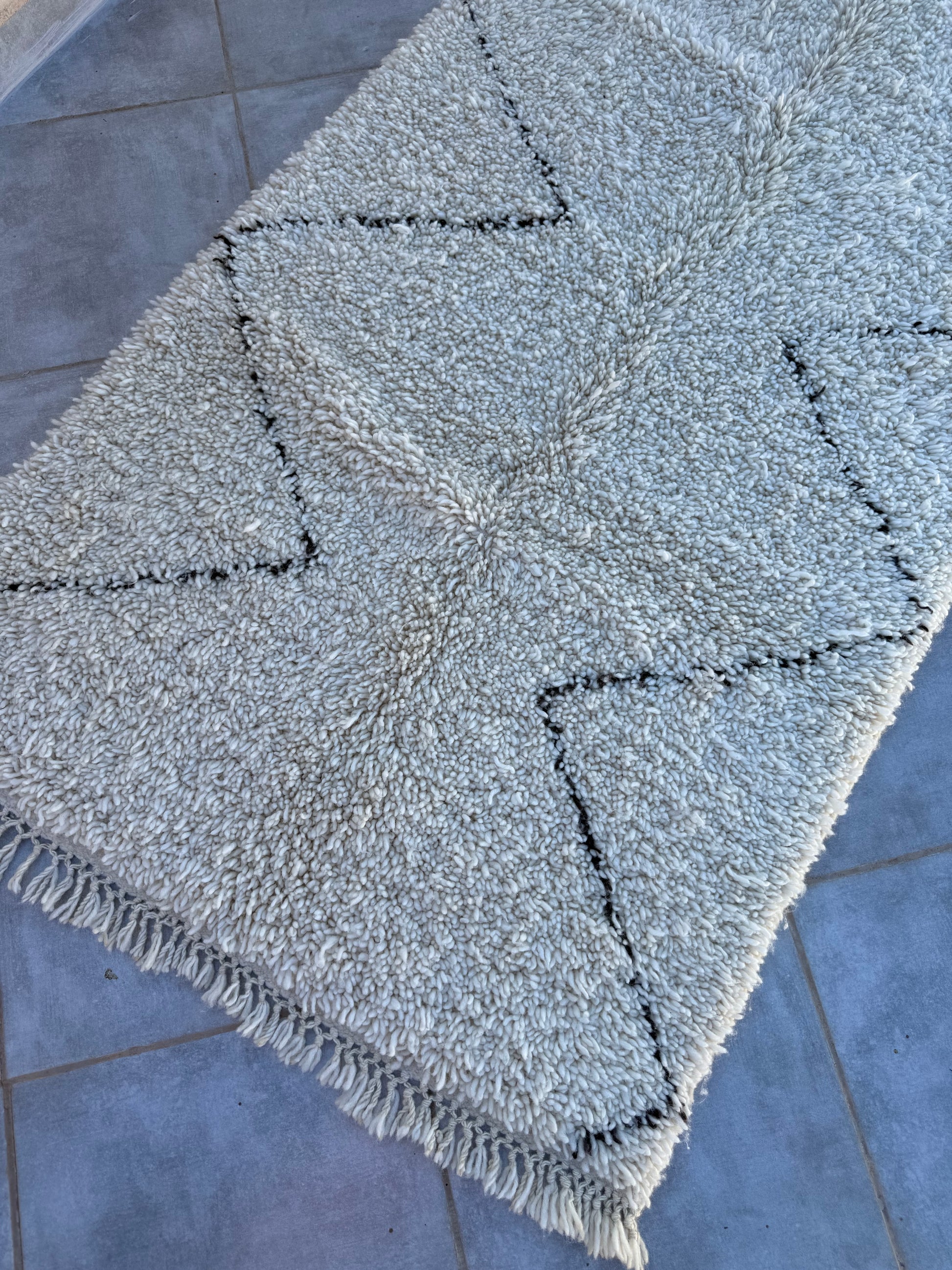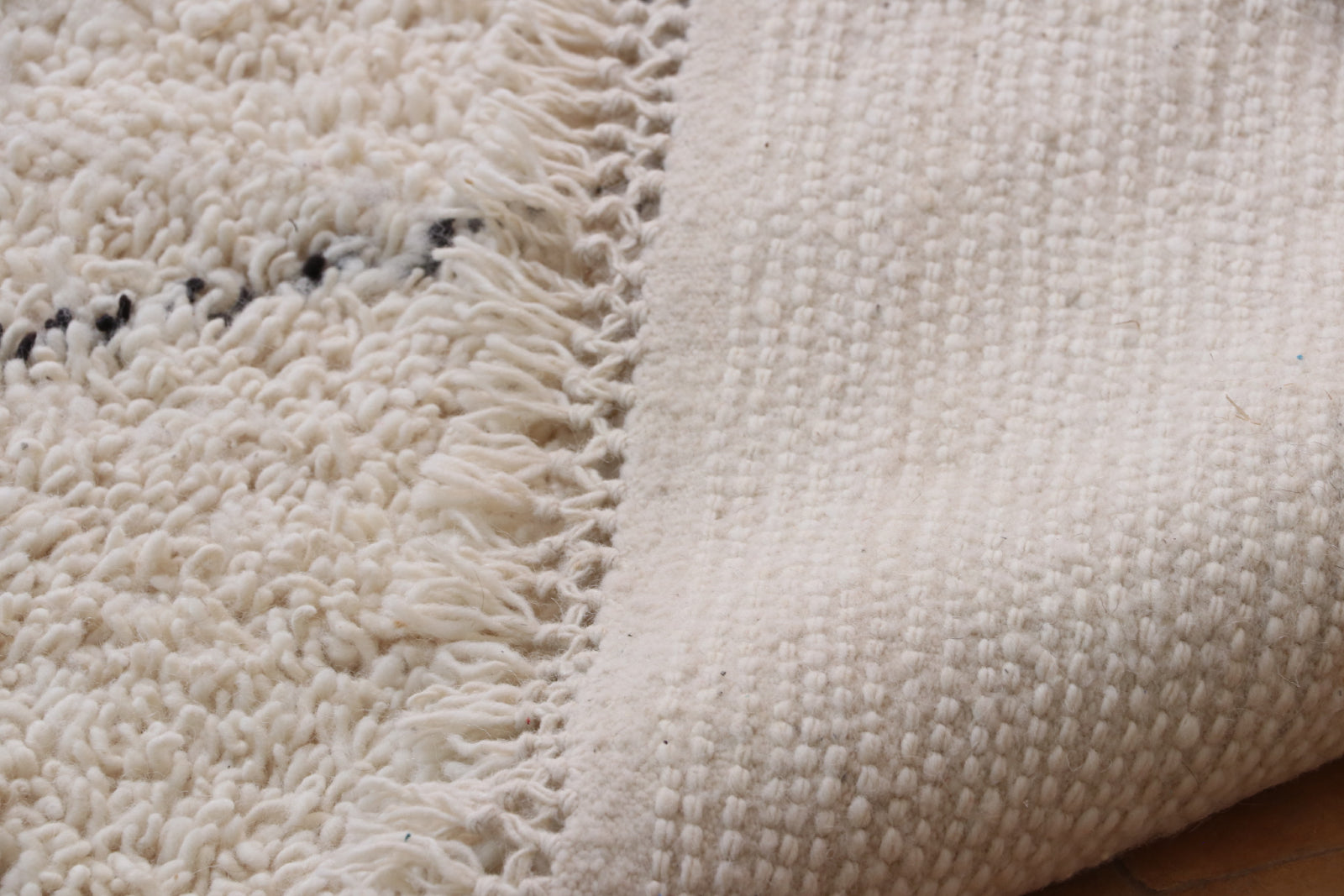 Pflege Wollteppiche (Beni Ourain, Beni Mrirt, Azial): Die Teppiche können ohne rotierende oder klopfende Bürsten abgesaugt werden. Wir empfehlen den Teppich gelegentlich auszuklopfen oder auszuschlagen, das entfernt effektiv Staub und Schmutz und der Teppich sieht wieder wunderbar frisch aus.