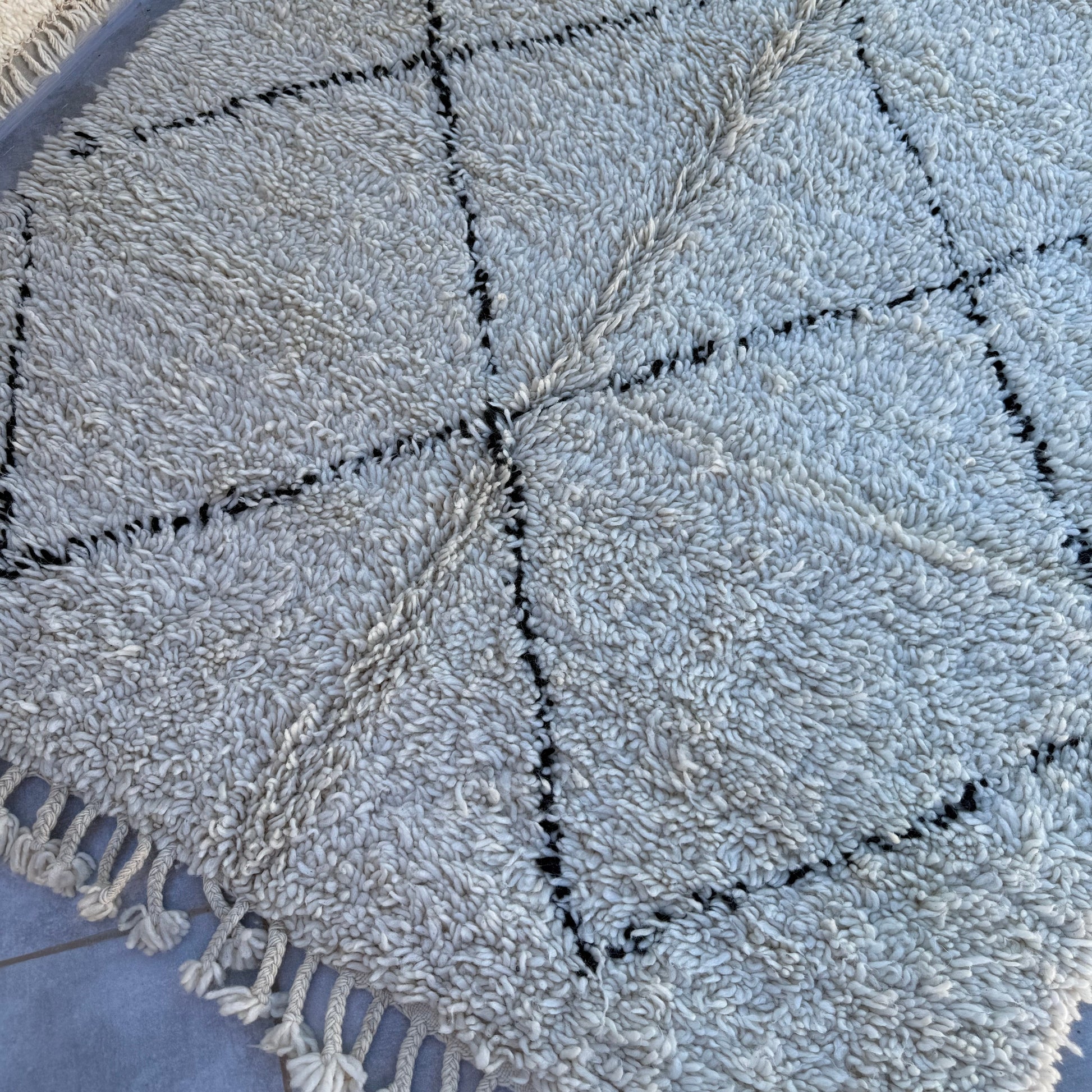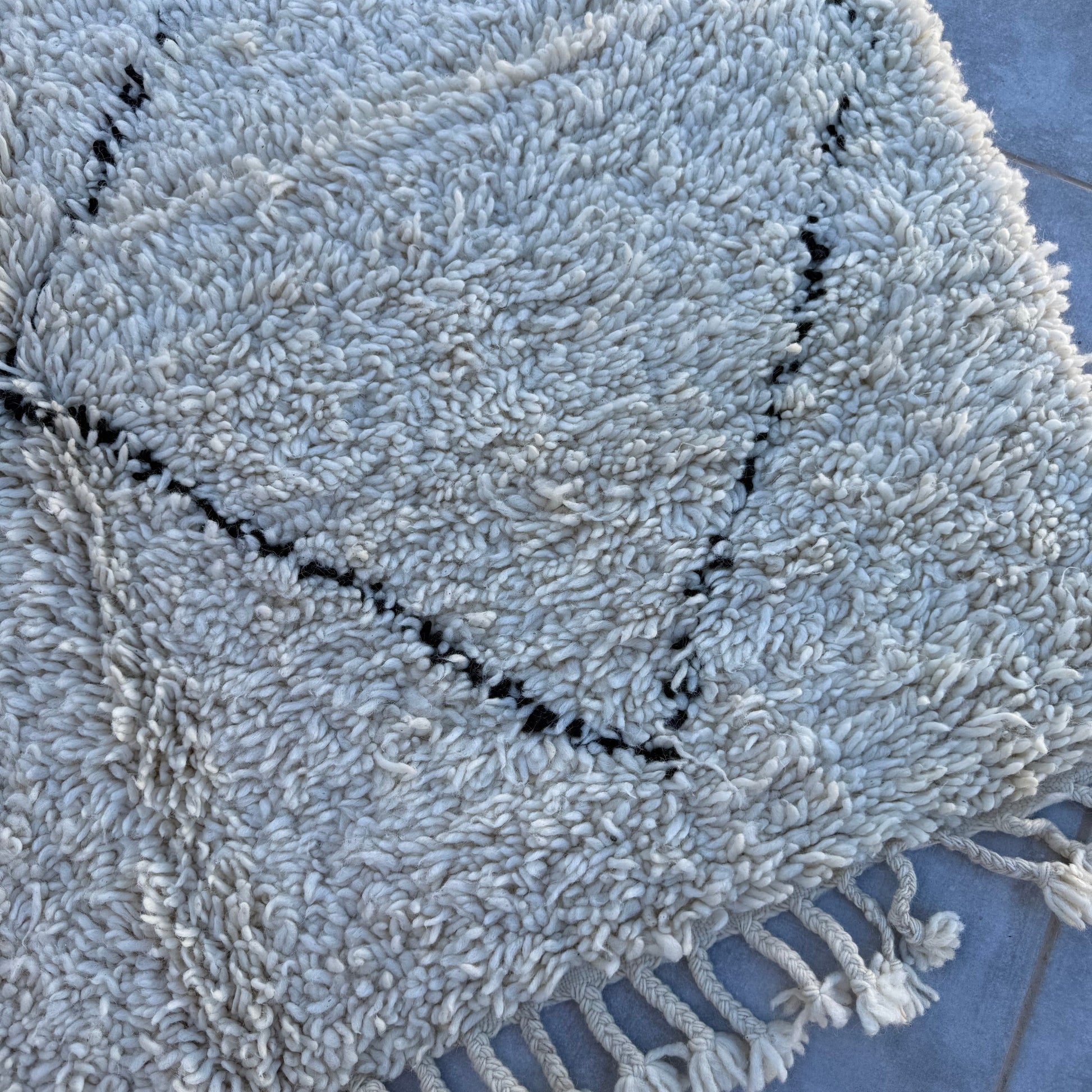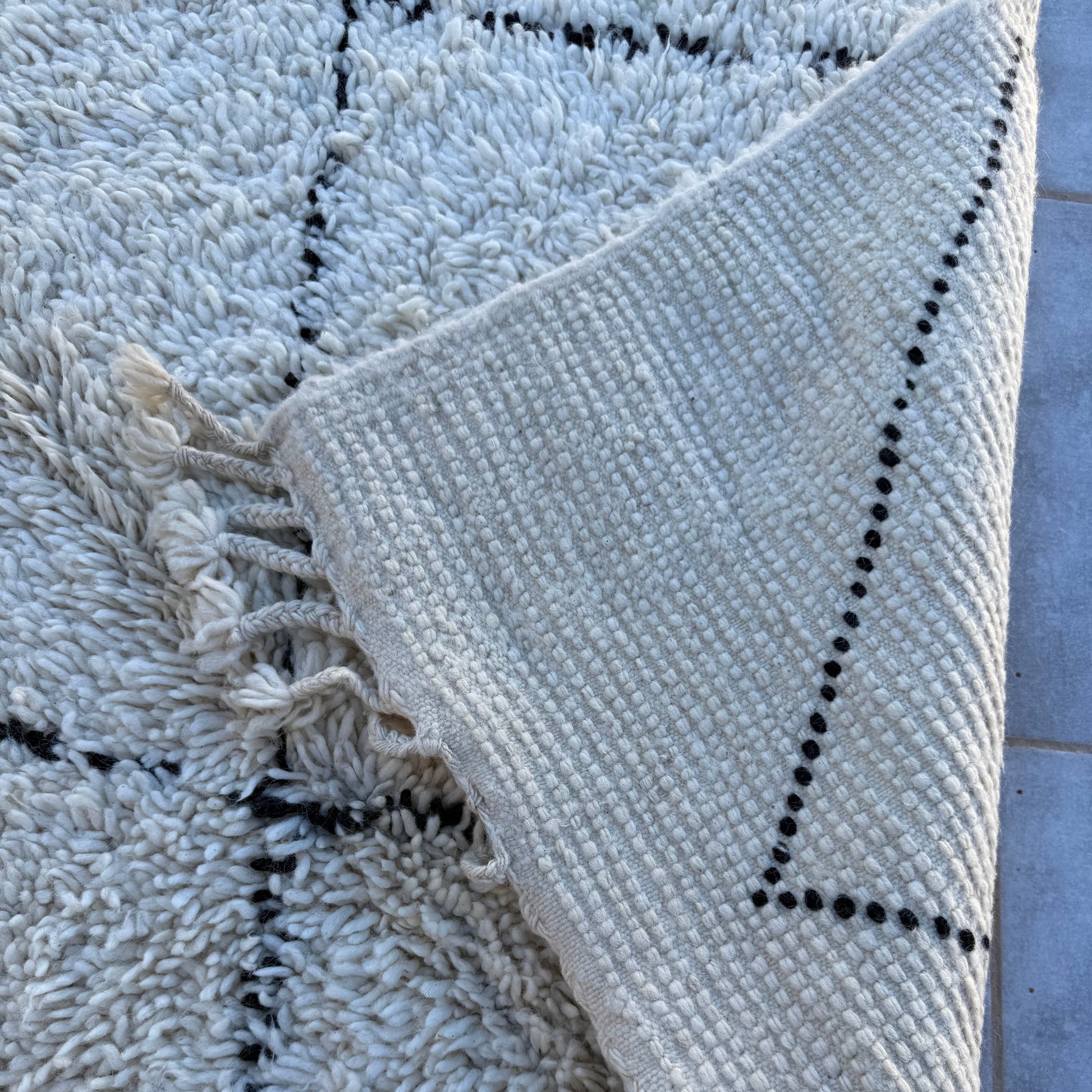 Pflege Wollteppiche (Beni Ourain, Beni Mrirt, Azial): Die Teppiche können ohne rotierende oder klopfende Bürsten abgesaugt werden. Wir empfehlen den Teppich gelegentlich auszuklopfen oder auszuschlagen, das entfernt effektiv Staub und Schmutz und der Teppich sieht wieder wunderbar frisch aus.