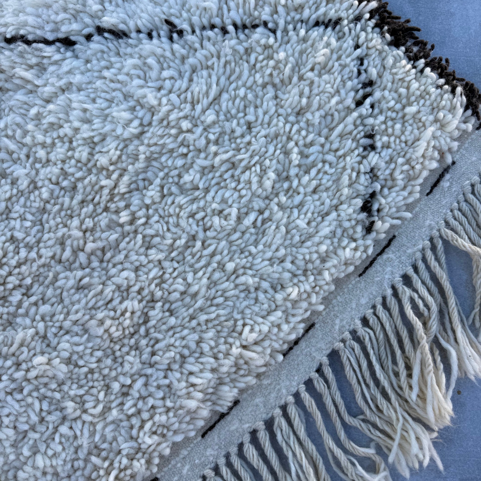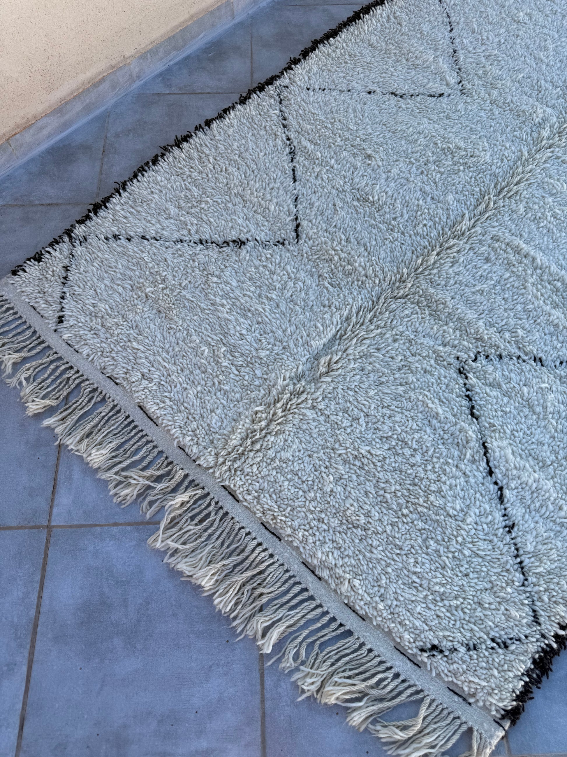 Pflege Wollteppiche (Beni Ourain, Beni Mrirt, Azial): Die Teppiche können ohne rotierende oder klopfende Bürsten abgesaugt werden. Wir empfehlen den Teppich gelegentlich auszuklopfen oder auszuschlagen, das entfernt effektiv Staub und Schmutz und der Teppich sieht wieder wunderbar frisch aus.