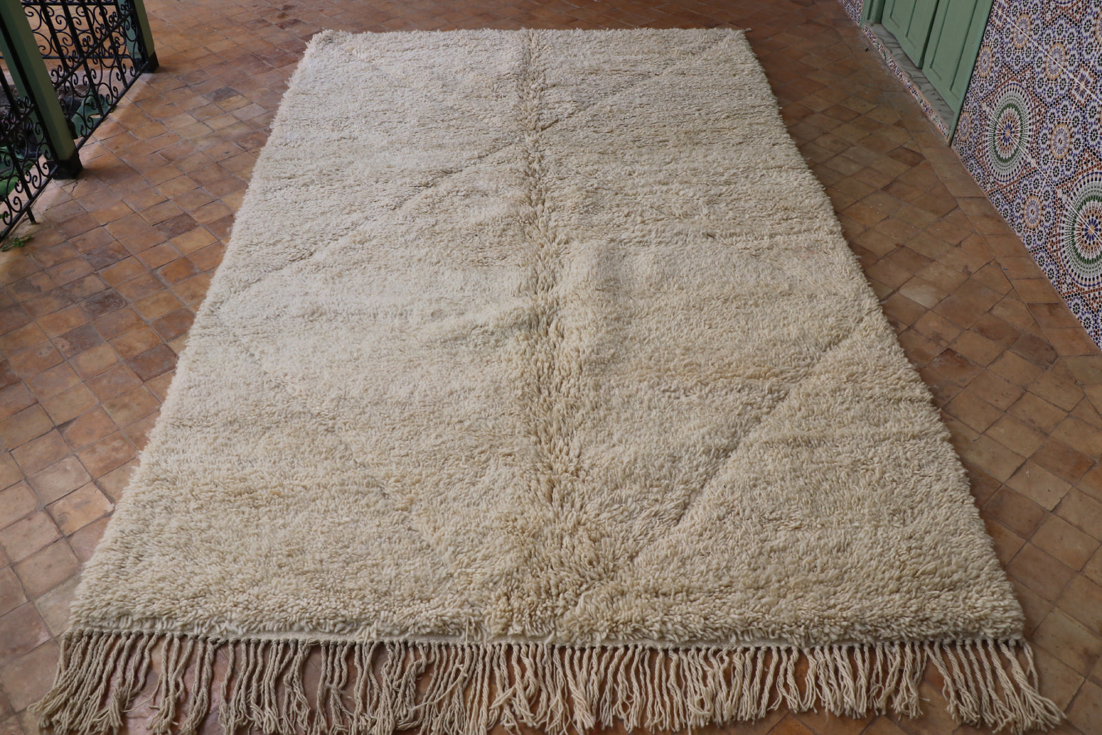 Pflege Wollteppiche (Beni Ourain, Beni Mrirt, Azial): Die Teppiche können ohne rotierende oder klopfende Bürsten abgesaugt werden. Wir empfehlen den Teppich gelegentlich auszuklopfen oder auszuschlagen, das entfernt effektiv Staub und Schmutz und der Teppich sieht wieder wunderbar frisch aus.
