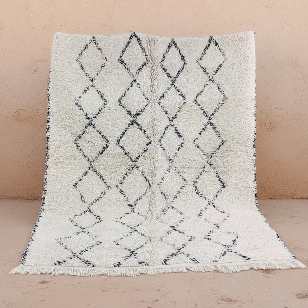 Herstellung: Unsere Beni Ourain Berber Teppiche werden traditionell, innerhalb der Berberfamilien von Hand gefertigt. In der traditionellen Herstellung wird noch weiche Schurwolle von Hochland-und Weideschafen verwendet. Hier entstehen einzigartige Unikate auf die ganz ursprüngliche Art. Da jeder Teppich einzeln gefertigt wird, kann es im Muster minimale Unterschiede geben.