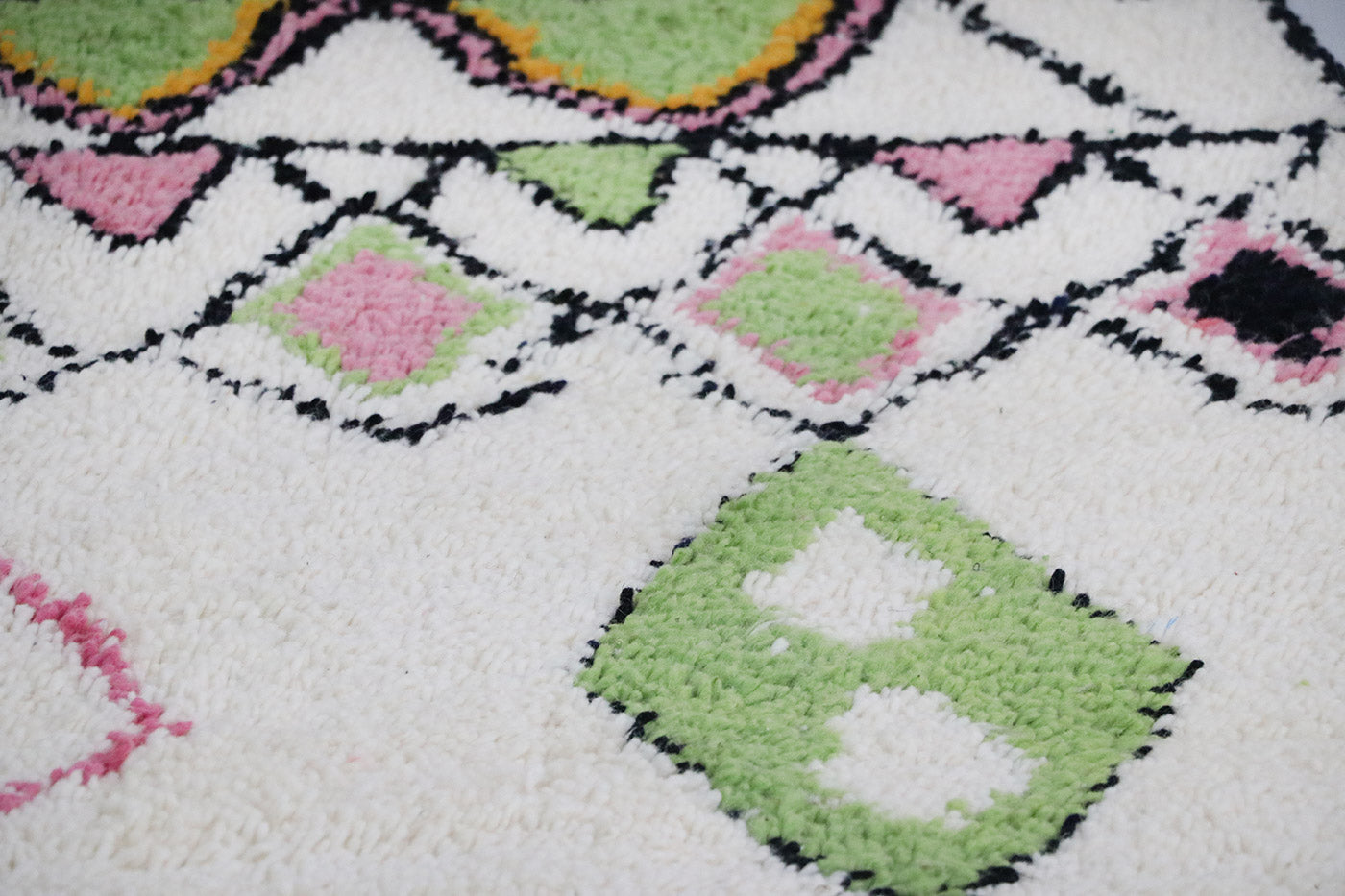 Handgefertigter marokkanischer Wollteppich vielen kleinen bunten und abstrahierten Rauten, die fast schon an wunderschöne Blüten erinnern. Der marokkanische Teppich aus der Region Azilal besticht durch sein fröhliches und warmes Design.
