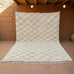 Handgefertigter, einfarbiger aber strukturierter marokkanischer Wollteppich. Der marokkanische Teppich aus der Region Azilal besticht durch sein schlichtes organisches Design und den abwechselnd geknüpften und gewebten Quadraten.